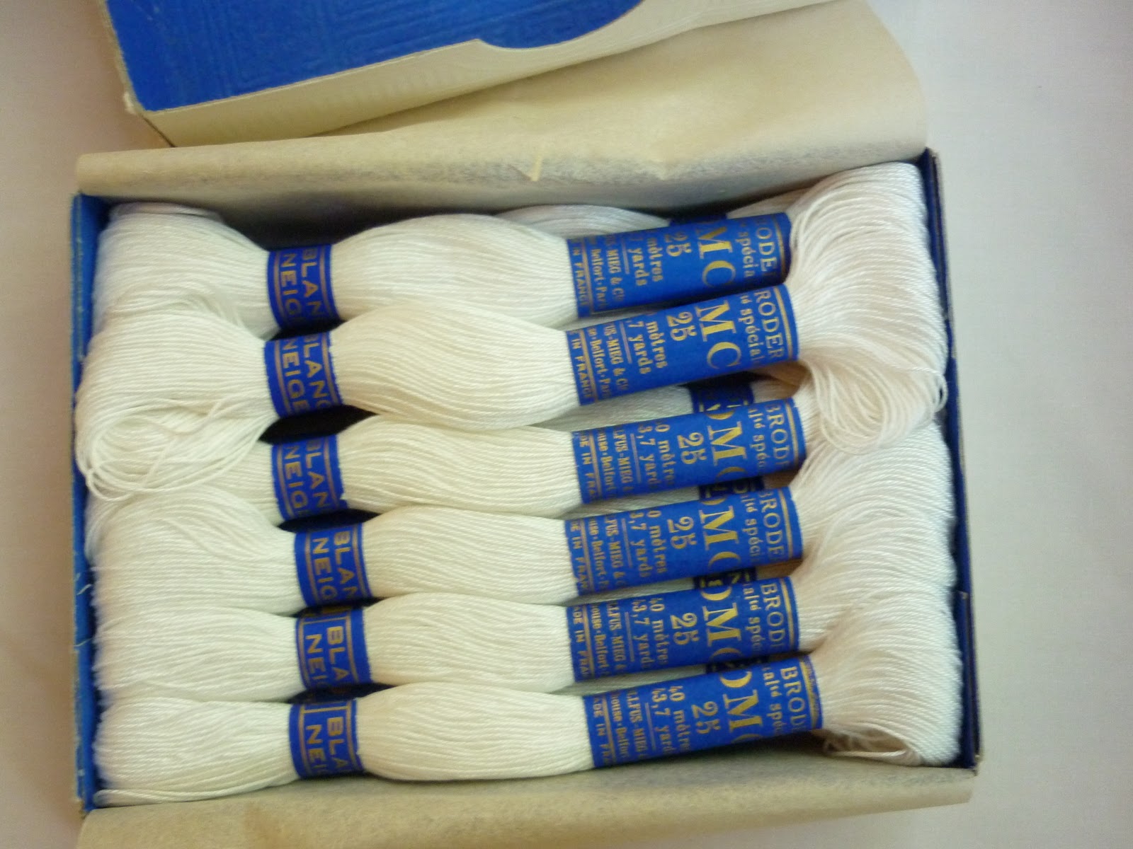For the grey areas I decided I wanted to repeat a pattern of the fabric in the quilting. These connected oval dots are on the green and red fabrics. I've quilted them with white DMC threads my mum got me in France. It was almost a shame to open them, the box was still sealed in it's original paper!